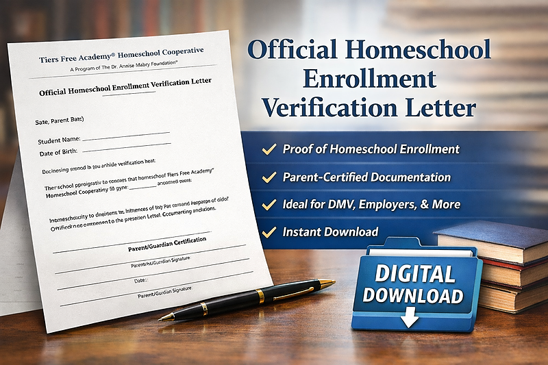 Need documentation for military, insurance, or sports eligibility? Receive a professionally crafted Enrollment Verification Letter from Tiers Free Academy® Homeschool Cooperative. This letter confirms active homeschool enrollment, outlines the cooperative's role, emphasizes parent-directed compliance, and offers official parent certification. It is suitable for employers, insurance providers, college applications, athletic eligibility, and government agencies.